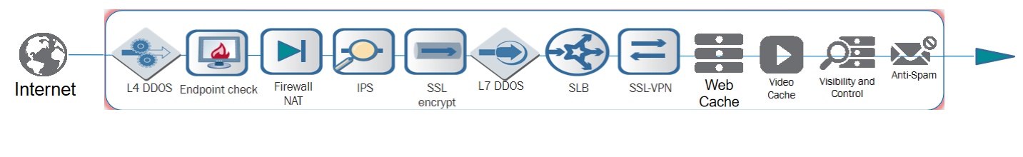 而且為了安全和合規(guī)的要求,往往會(huì)在互聯(lián)網(wǎng)出口區(qū)域采用“糖葫蘆串兒”的方式堆積多種安全設(shè)備,類似下面這樣的網(wǎng)絡(luò)部署: