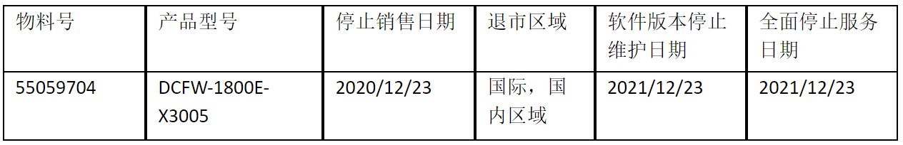 北京神州數(shù)碼leyu.樂魚信息技術有限公司正式通知您, 以上DCFW-1800E-X3005下一代防火墻(55059704)將于20201223號停止接收新的訂單(具體日期見上表),不再供貨。給您帶來的不便,敬請原諒。
